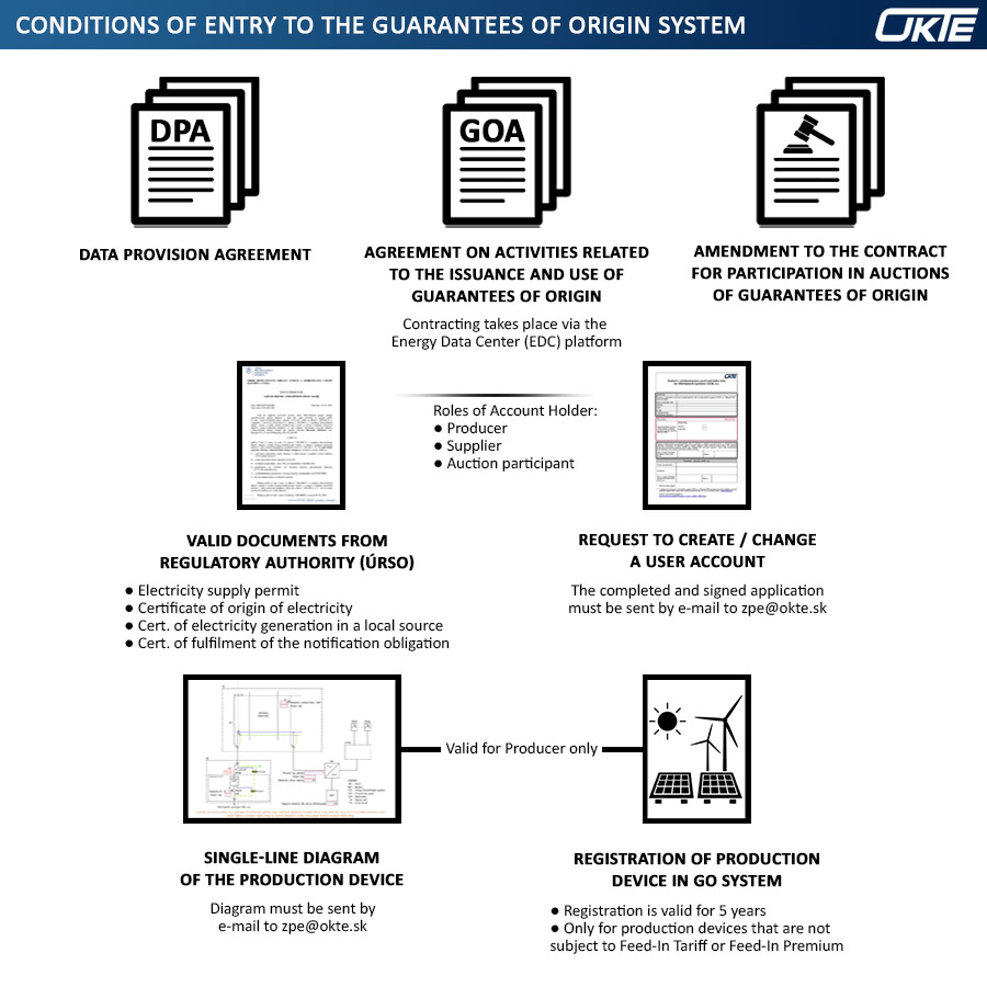 The following images illustrate the relationships within the framework of guarantees of origin of energy, the conditions for entry into the system and its functioning in schematic form. All diagrams relate to the territory of the Slovak Republic, where OKTE, a.s. is the issuer and administrator of guarantees of origin of energy since 1.1.2020.